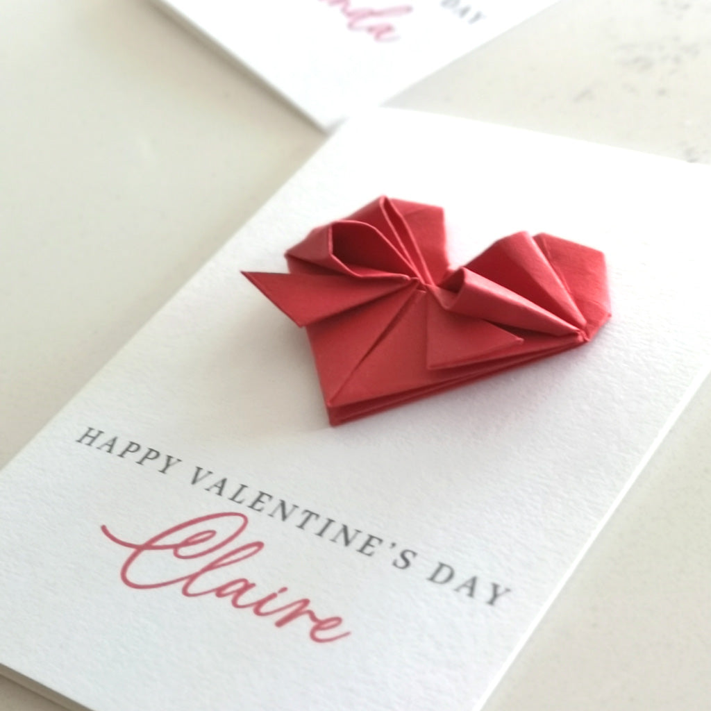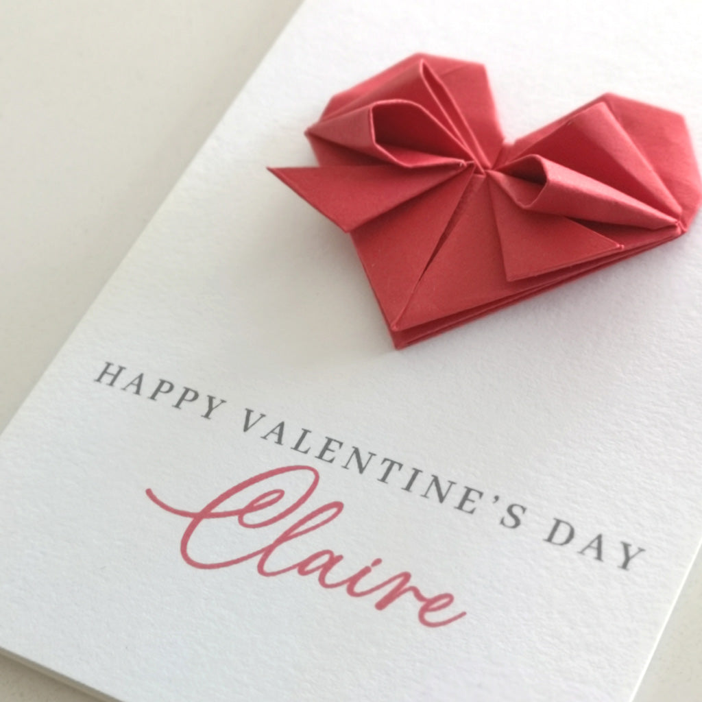 This elegant handmade Happy Valentine's Day card features a beautifully hand-folded origami heart with bow crafted from beautiful red or pink paper.